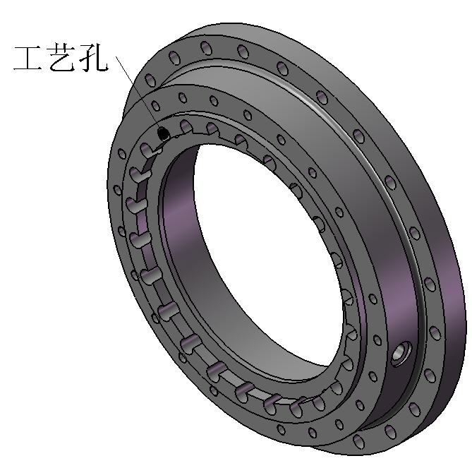 ①圖中輸出軸承分布在輸出軸的兩端,把軸承距離更大化,可實現徑向受力更大化。軸承系列為調心滾子軸承,滿足承載力的同時,也實現了加工,安裝誤差的補償(如圖2);②輸出方式采用內花鍵輸出(通常挖掘機械主刀盤是通過傳動軸過渡傳遞的),這種方式滿足了傳動軸減速機輸出的更大徑向受力,受力支點基本上近似在輸出大軸承上(如圖1);③多級減速,為提高工作時的效率,應盡量避免機械摩擦,此減速機在各級中間太陽輪前增加一個軸承,來防止行星架之間產生機械摩擦,同時也降低了噪聲與溫升(如圖1);④各級行星輪內軸承采用調心滾子軸承來替換傳統的圓柱滾子軸承,更好的防止加工,安裝誤差對齒輪嚙合的影響(如圖1);⑤行星架采用分體籠式結構,有效的避免受力不均,分體結構中與太陽輪連接部才用鍛件合金鋼,非主受力部采用普通鑄鋼,可以降低鑄造成本又能保證質量,分體間連接采用螺釘與定位銷共存(如圖3);⑥行星架與中間太陽輪采用花鍵聯結,保證足夠的力矩傳遞,與中間太陽輪聯結增加銷軸軸向定位,防止減速機高速運轉時離心力不均導致行星架整體軸向串動(如圖4);⑦各法蘭部件中為減輕重量,在不影響受力情況下增加工藝孔,增大內腔空間體積,更有效的潤滑各零部件(如圖5);⑧減速機外形更大尺寸為900mm,更大轉矩達34萬Nm,有效的節約安裝空間,減輕機重;⑨由于挖掘機械工作環境較為惡劣,針對密封方面,在輸出,輸入法蘭端面上增加“O”型密封圈,保證安裝后減速機內部密封等級,輸出軸在轉速≤5m/s,使用溫度在-35~+200℃,工作介質為水,汽,油的情況下可采用軸用方形圈GSI來密封(耐壓在0~40MPa),各零部件固定聯結時均增加“O”型密封圈。
